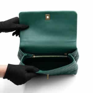 Designed for both sophistication and practicality, the bag features a structured top handle for elegant hand carry, alongside a detachable leather-interwoven chain strap that allows for effortless shoulder or crossbody wear. The polished hardware and signature turn-lock closure complete the classic aesthetic. The interior is thoughtfully compartmentalised, offering organised storage for daily essentials while maintaining a sleek and compact profile.