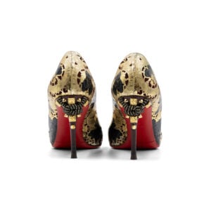 Sitting atop a refined 85mm stiletto heel, the silhouette exudes elegance while offering a comfortable lift that complements both evening sophistication and statement-day styling. The structure features sculptural cut-outs that wrap gracefully around the foot, enhancing the dramatic visual impact and creating a bold, wearable work of art. Finished with Louboutin’s iconic signature red sole, this design epitomizes luxury innovation and collectible opulence.