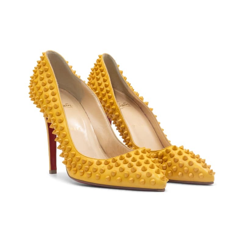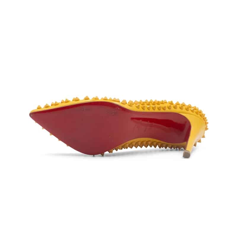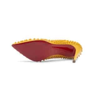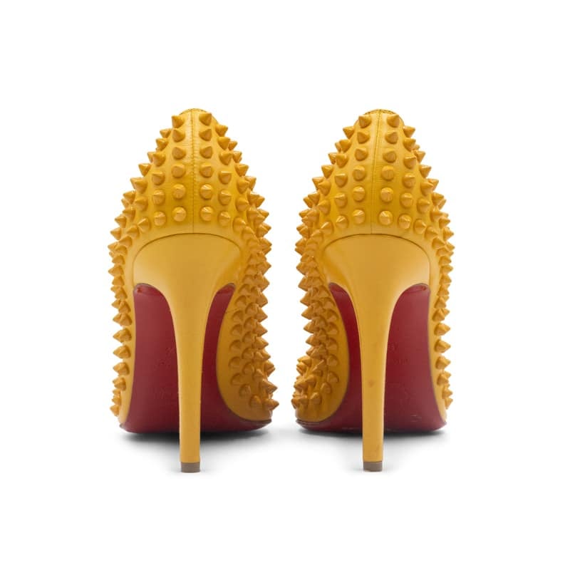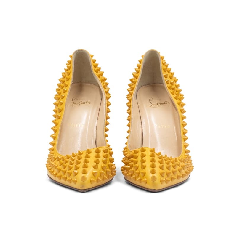 The Christian Louboutin Yellow Leather Bianca Spike Pumps are a bold and striking statement piece, showcasing the Maison’s signature fusion of elegance and rebellious edge. Crafted in yellow leather, the pumps are embellished with glossy tonal spikes, creating a daring contrast between femininity and punk-inspired detail.