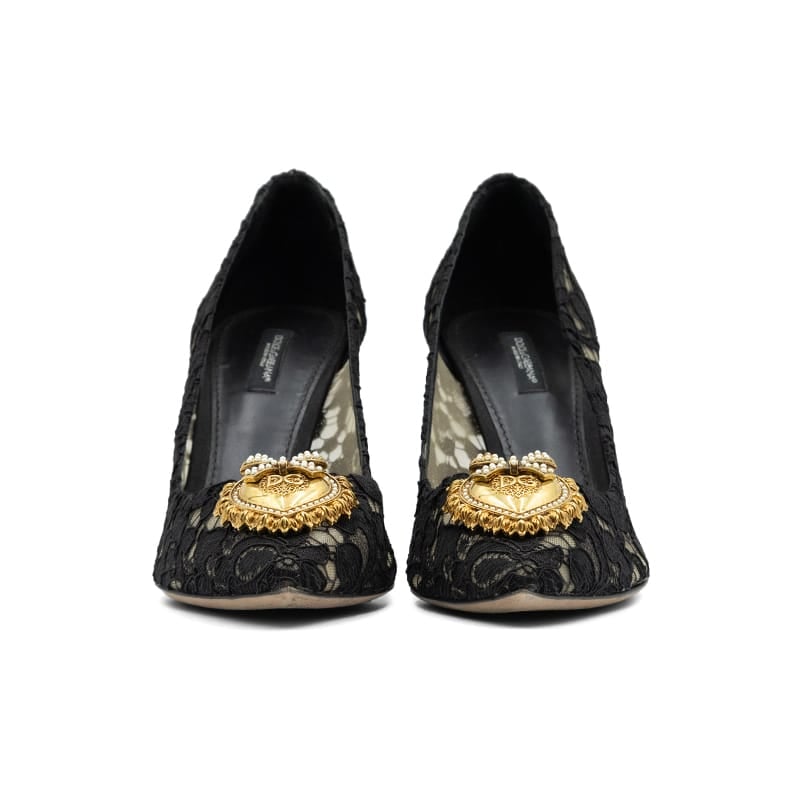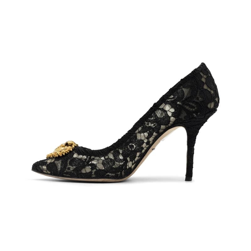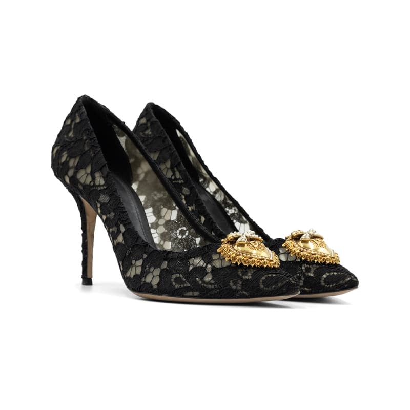 Expertly crafted in Italy, these pointed-toe pumps are adorned with delicate black Taormina lace, offering a refined texture and timeless allure. The standout feature is the ornate heart-shaped Devotion jewel on the vamp, hand-finished with antique gold-tone metal and pearl detailing—a signature emblem of Dolce & Gabbana’s opulent aesthetic. Set on a slim stiletto heel, they exude grace while elongating the leg for an effortlessly sophisticated silhouette.