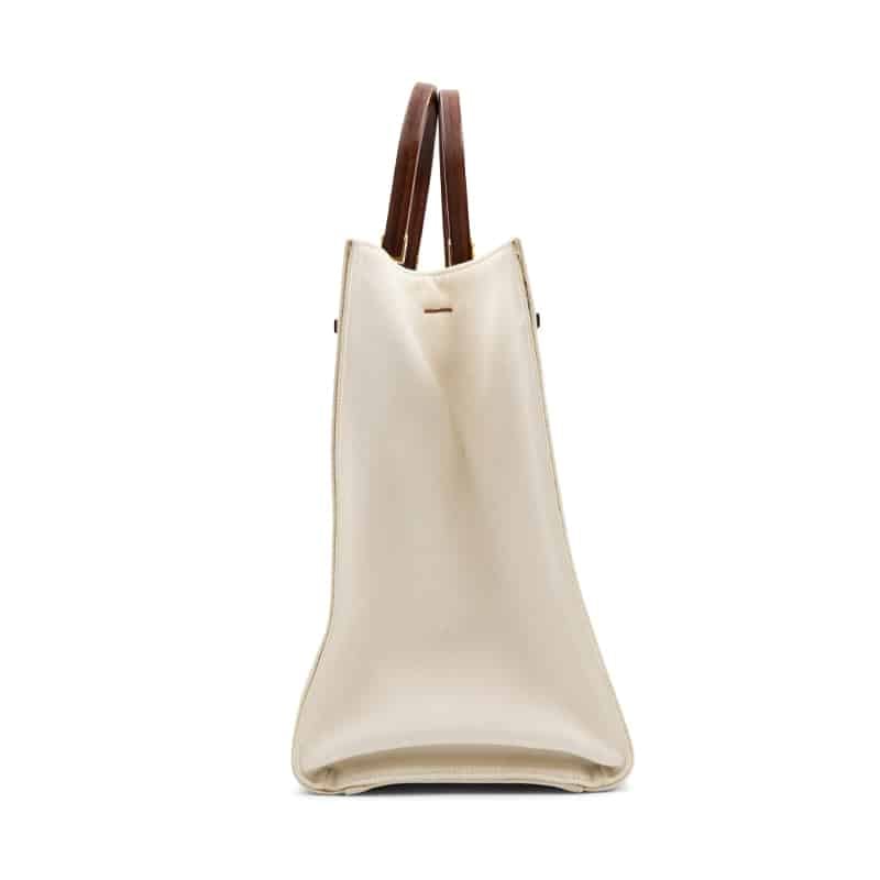 Designed with a spacious interior, the Sunshine Shopper Tote is ideal for everyday use, offering ample room for essentials and more. Distinctive dark wood dual top handles add an architectural touch, while the detachable shoulder strap and gold-tone hardware provide versatile styling options and a luxurious finish. Completed with a clean, structured silhouette, this tote is both practical and effortlessly chic.