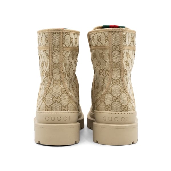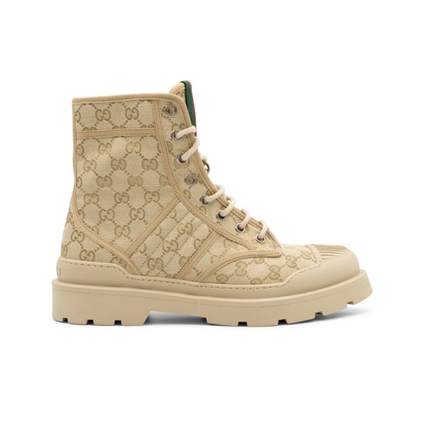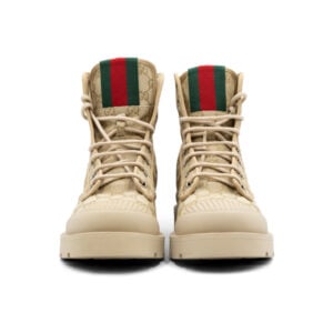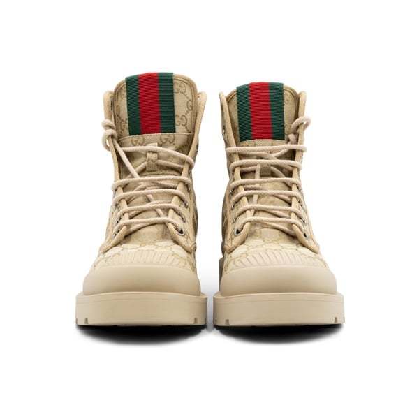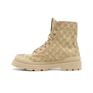 A signature green and red Web stripe accents the tongue, adding a distinctive nod to Gucci’s equestrian heritage. Defined by their chunky lug sole, this design offers both traction and a modern, statement aesthetic. The lace-up front ensures a secure fit, while the overall construction balances practicality with elevated style.