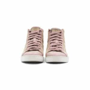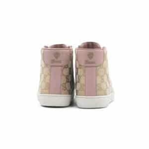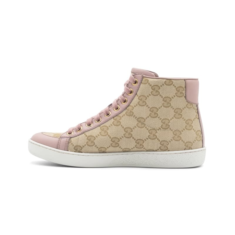 Crafted in Gucci’s signature beige GG Original canvas, the design is accented with smooth pink leather panels for a vibrant contrast. The high-top silhouette features a lace-up front, padded ankle support, and tonal stitching for a refined finish. Set on a durable rubber sole, these sneakers embody Gucci’s seamless balance of fashion and functionality.