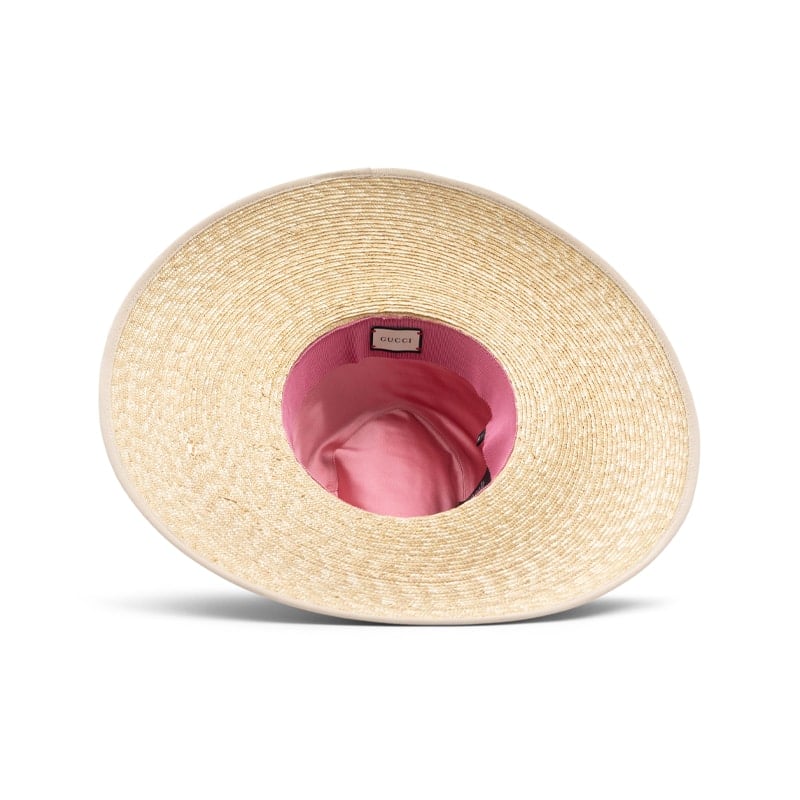 Made in Italy, the hat is woven from beige straw, creating a lightweight yet structured silhouette perfect for warm-weather styling. Its wide brim provides elegant sun coverage, while the crown is adorned with Gucci’s signature GG motif in shimmering crystal embellishments, adding a radiant touch. Timeless and versatile, this hat transitions seamlessly from chic daytime outings to elevated evening resort looks.