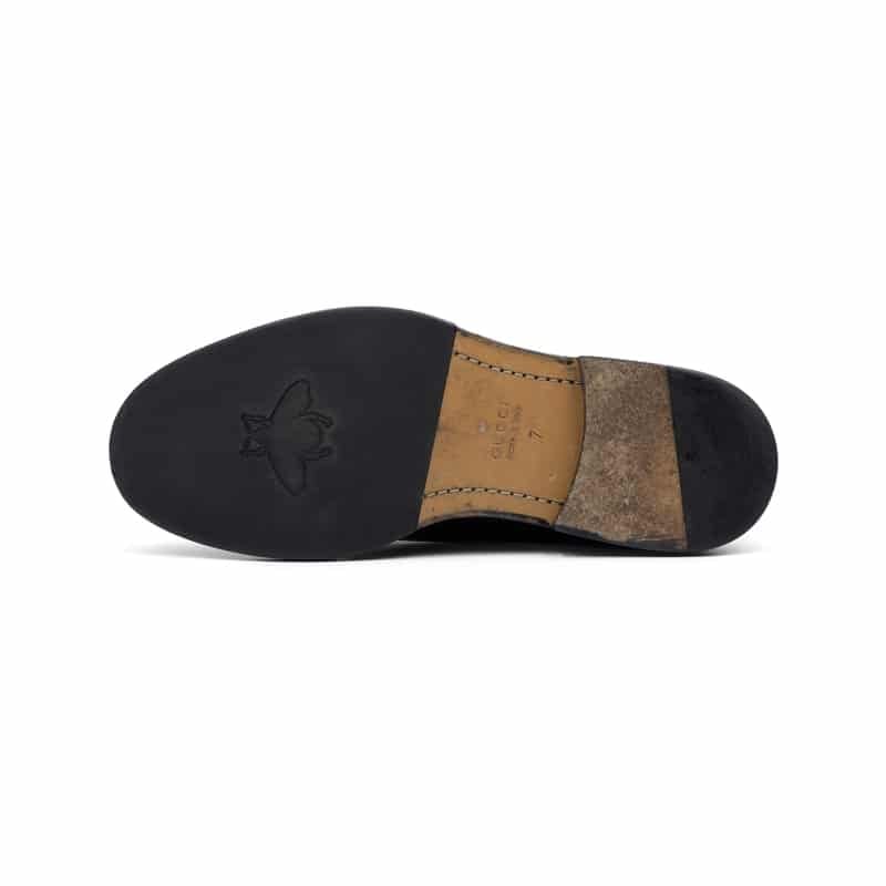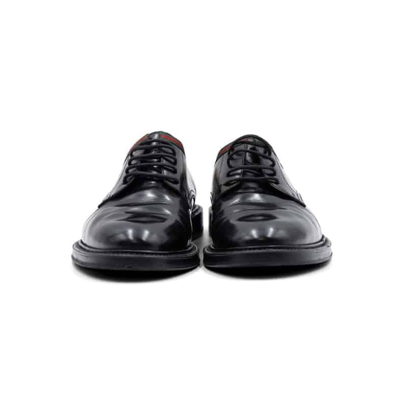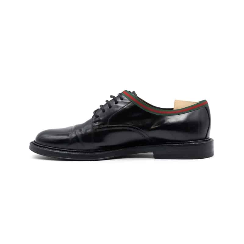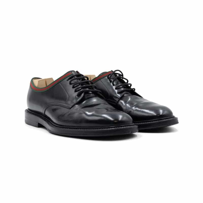 Adding a distinctive Gucci touch, the design is accented with the brand’s signature green and red Web canvas trim around the top of the shoe opening. This iconic stripe references Gucci’s equestrian heritage while introducing a subtle yet unmistakable element of brand identity. The open-lacing Derby construction ensures comfort and flexibility, while the sleek profile maintains a sophisticated and contemporary look.