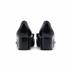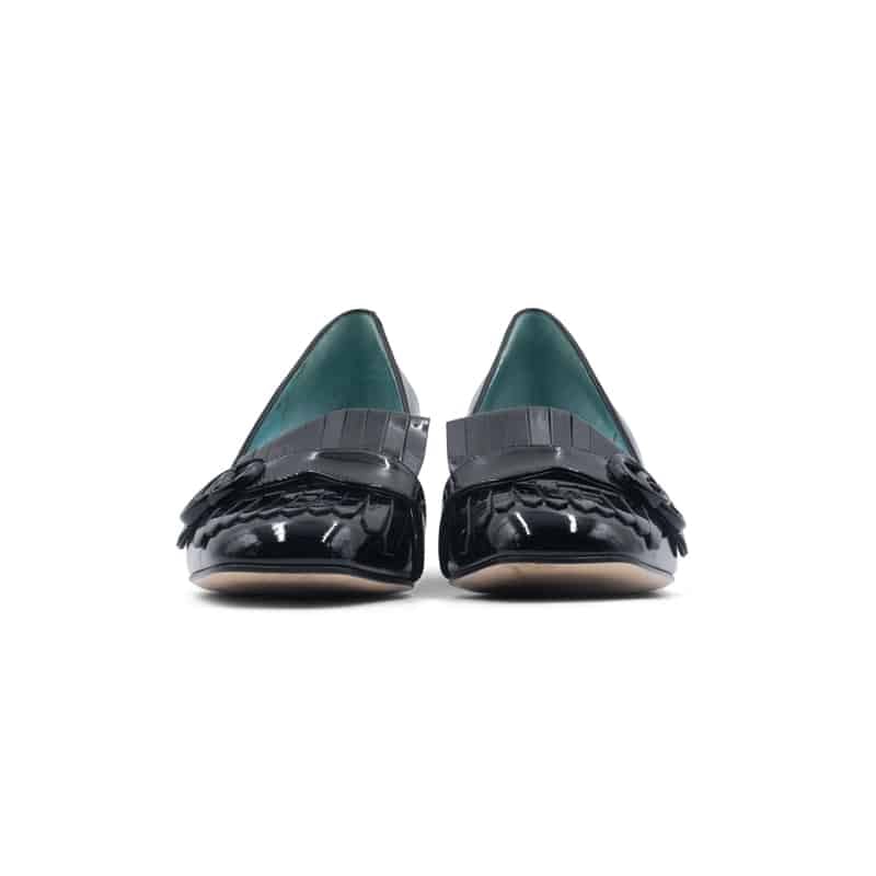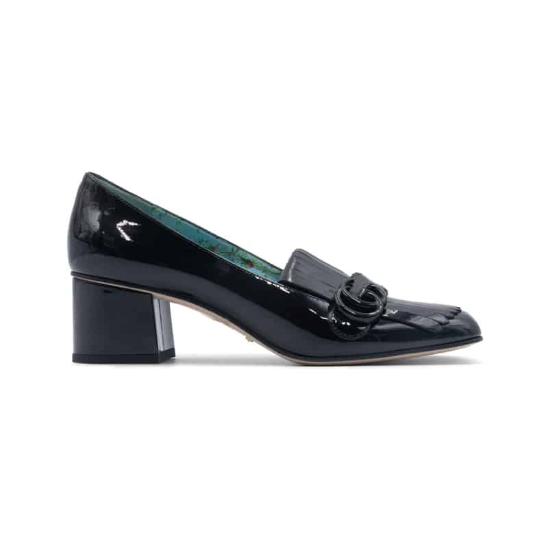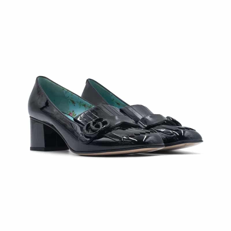 Crafted in glossy black patent leather, the design features a round toe, signature fringe detailing across the vamp, and the signature Marmont GG hardware in tonal glossy lettering. The mid-block heel offers comfort and versatility, making them suitable for both day and evening wear.