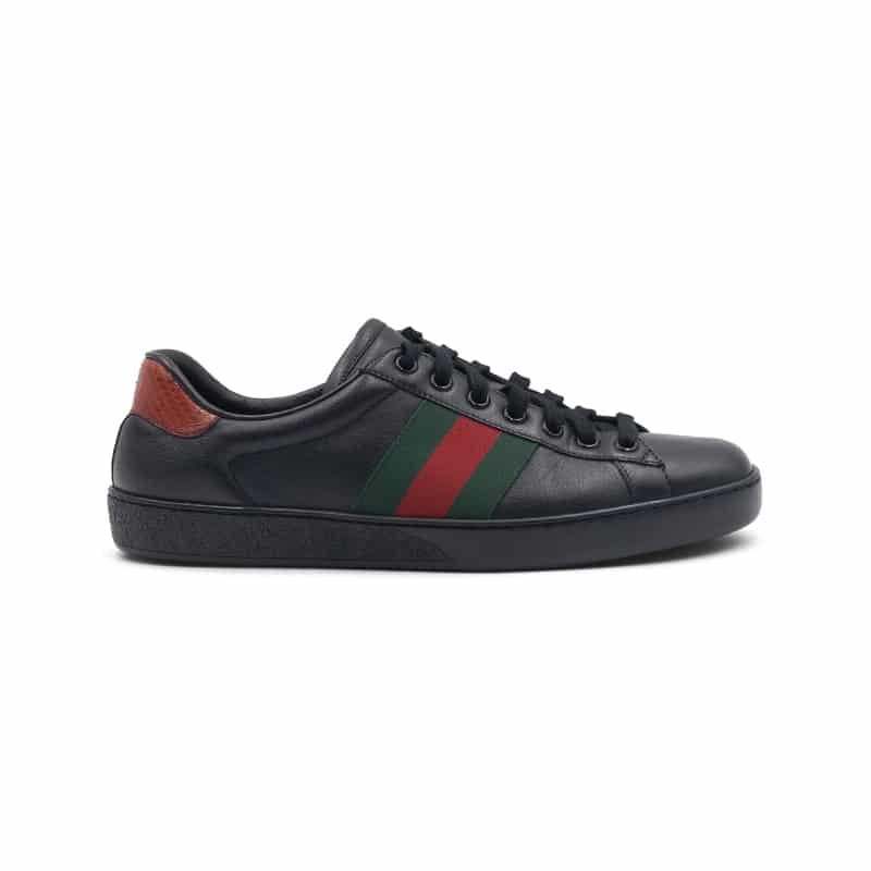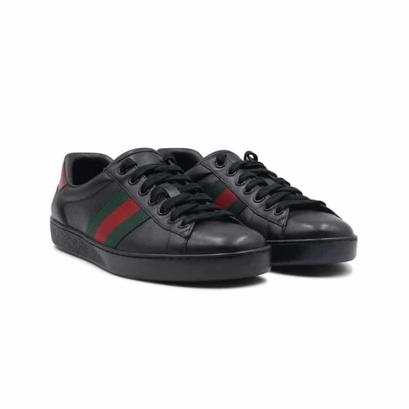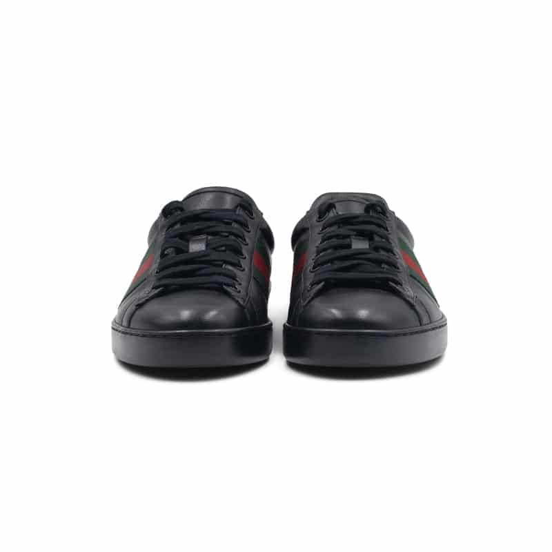 Crafted in Italy from smooth black leather, the Ace sneakers feature Gucci’s signature red and green web stripe along the sides — a hallmark of the House’s heritage. The low-top silhouette is complemented by tonal stitching, a round toe, and a comfortable leather lining. The heel tab is finished in contrasting red metallic leather embossed with the Gucci logo, while the textured rubber sole ensures durability and grip. Each element reflects the brand’s dedication to impeccable craftsmanship and modern versatility.