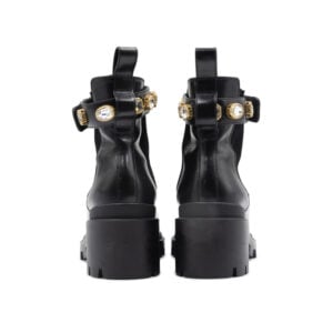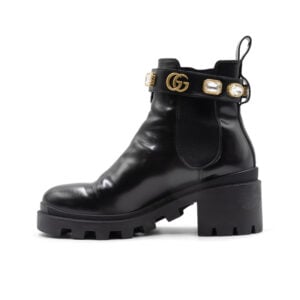 The Gucci Calfskin Crystal GG Trip Chelsea Ankle Boots redefine contemporary luxury with bold detailing and iconic house elements. Crafted from smooth black calfskin leather, these statement boots are adorned with shimmering crystal-embellished GG logos that lend a glamorous edge to the utilitarian silhouette.