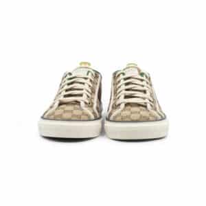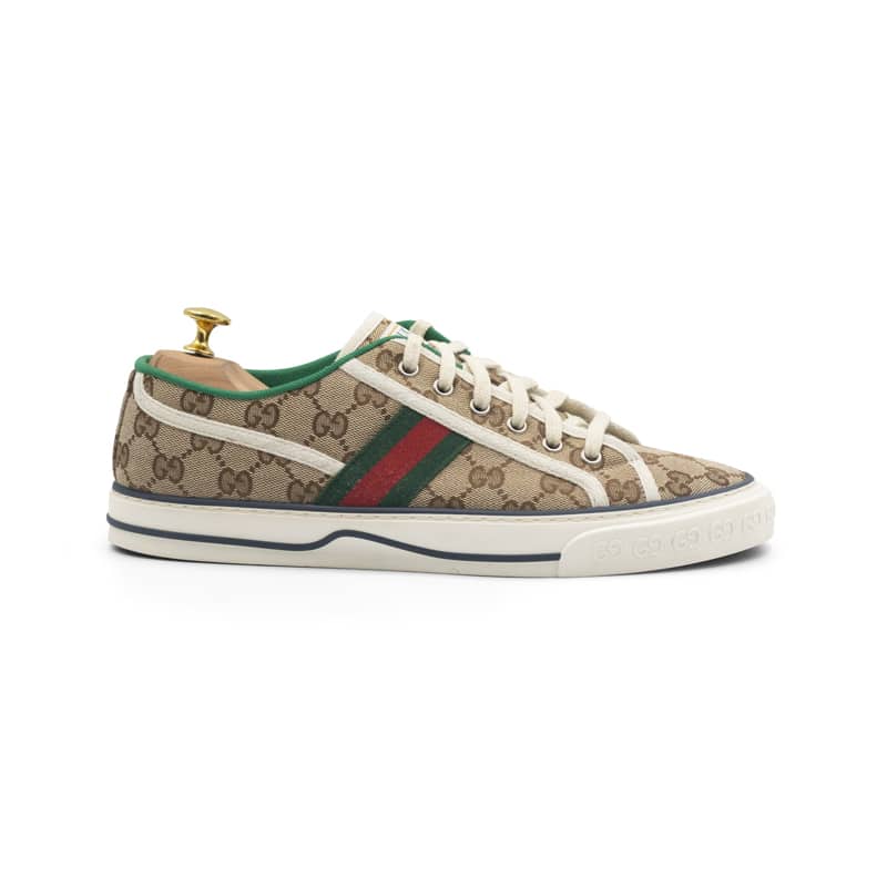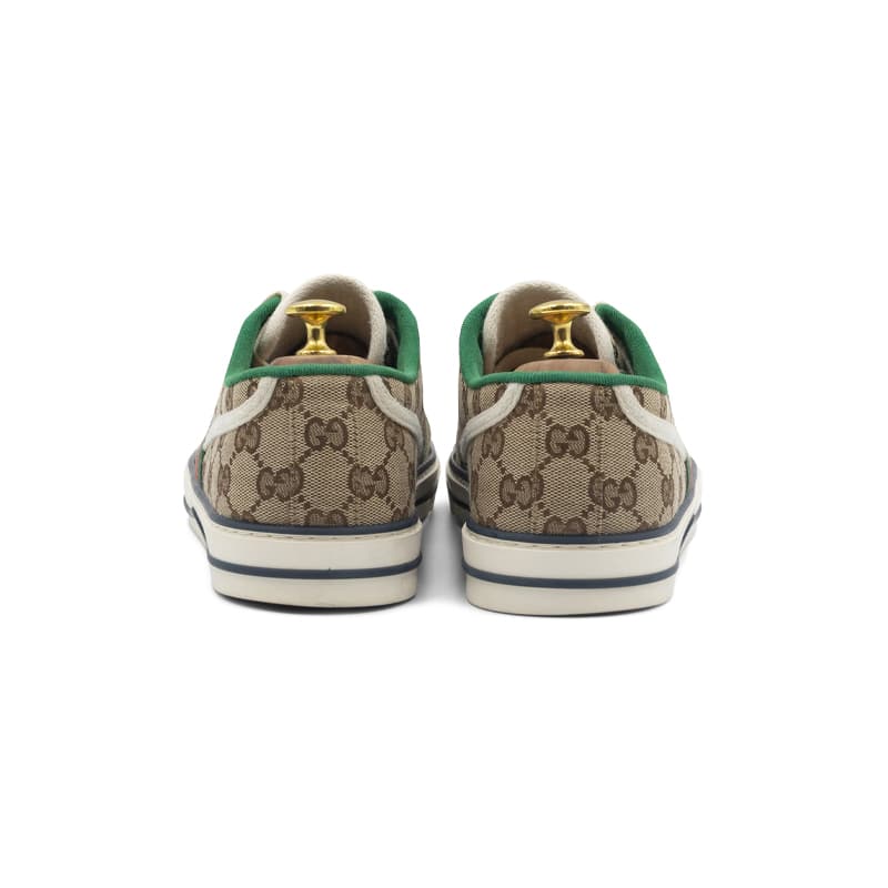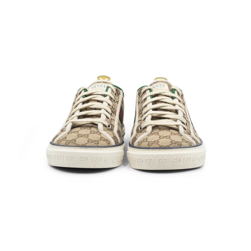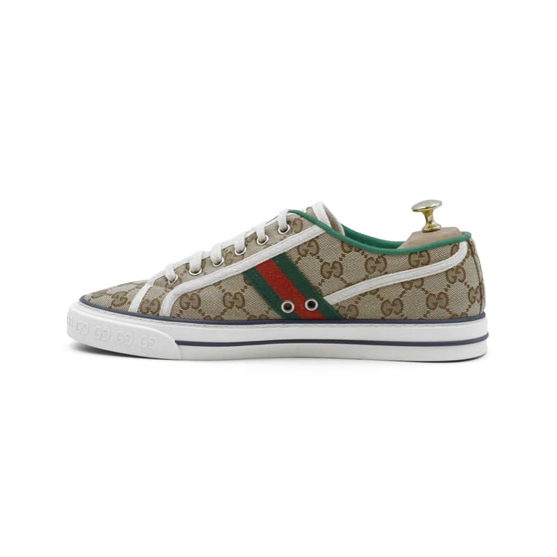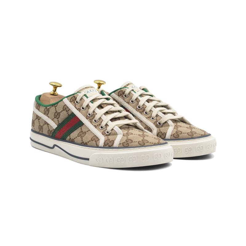 Expertly crafted in Italy, the trainers feature beige and ebony GG Supreme canvas, trimmed with green and red web detailing — an homage to Gucci’s equestrian roots. The low-top silhouette is accented with contrast piping and set on a durable rubber sole embossed with the signature Gucci logo. A soft fabric lining ensures superior comfort, making these trainers perfect for everyday wear while maintaining an elevated aesthetic.