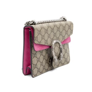 The Gucci GG Supreme Pink Suede Mini Dionysus is a refined yet statement-making piece that blends the House’s iconic materials with a soft, feminine touch. Crafted from GG Supreme canvas, the structured mini silhouette is elevated with rich pink suede accents, adding texture and a distinctive contrast to the classic monogram.