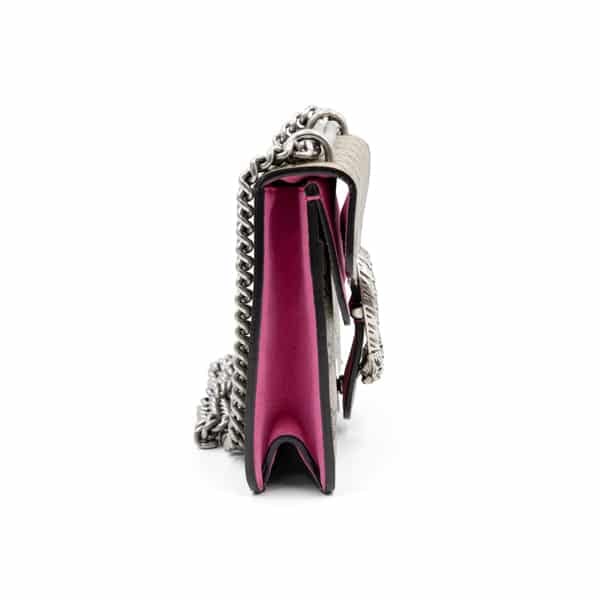 The front flap is defined by the signature tiger head spur closure — an emblem of the Dionysus line inspired by Greek mythology. Compact yet functional, the interior is designed to hold small essentials, while the sliding chain strap allows for both shoulder and crossbody wear. Elegant and versatile, this piece transitions effortlessly from day to evening styling.