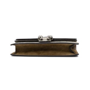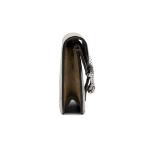 The front flap is defined by the iconic tiger head spur closure — a signature of the Dionysus line — referencing the Greek god from which the collection takes its name. Despite its scaled-down proportions, the interior is thoughtfully designed to accommodate small essentials, making it ideal for both day-to-evening styling. A sliding chain strap allows for shoulder or crossbody wear, offering versatility within a refined, fashion-forward profile.