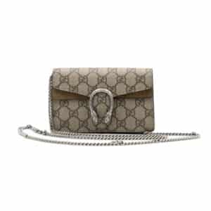 The Gucci GG Supreme Super Mini Dionysus is a compact yet statement-making piece that reflects the House’s distinctive heritage aesthetic. Crafted from GG Supreme canvas in the signature beige and ebony palette, this miniature silhouette is elevated with textured leather trim for added structure and durability.