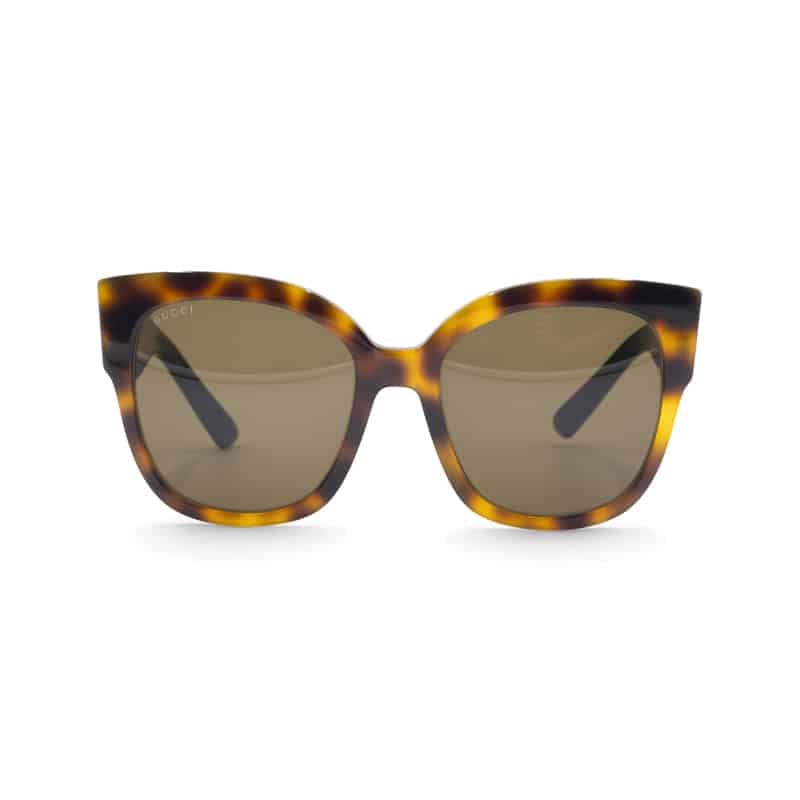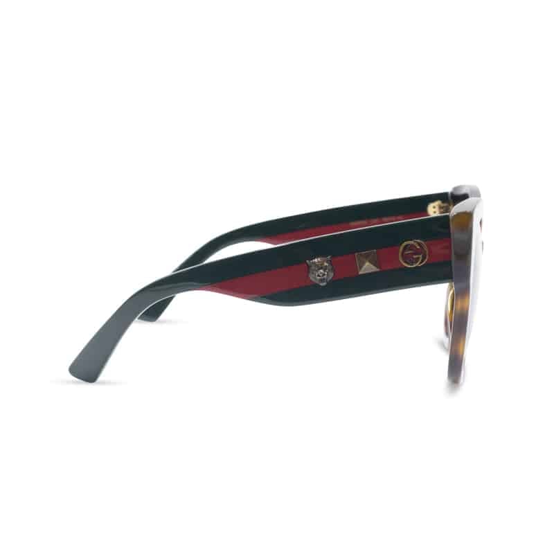 Crafted in Italy, the Havana acetate frame is complemented by brown gradient lenses offering 100% UV protection. The temples feature Gucci’s iconic red and green Web stripe with the distinctive tiger and star motif, adding a playful yet luxurious touch. Finished with gold-tone detailing and engraved Gucci logos on the arms, these sunglasses embody a balance of vintage-inspired glamour and contemporary style.