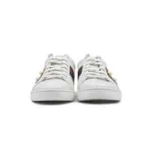 Crafted from smooth white leather, the sneakers feature signature faux pearl and stud embellishments along the sides and heel, creating a distinctive and playful aesthetic. The lace-up design ensures a secure fit, while the padded tongue and collar provide comfort for all-day wear. The rubber sole adds durability and traction, making them ideal for both casual and elevated street style looks.