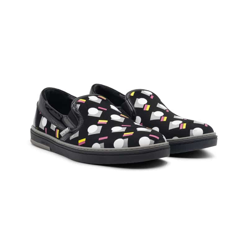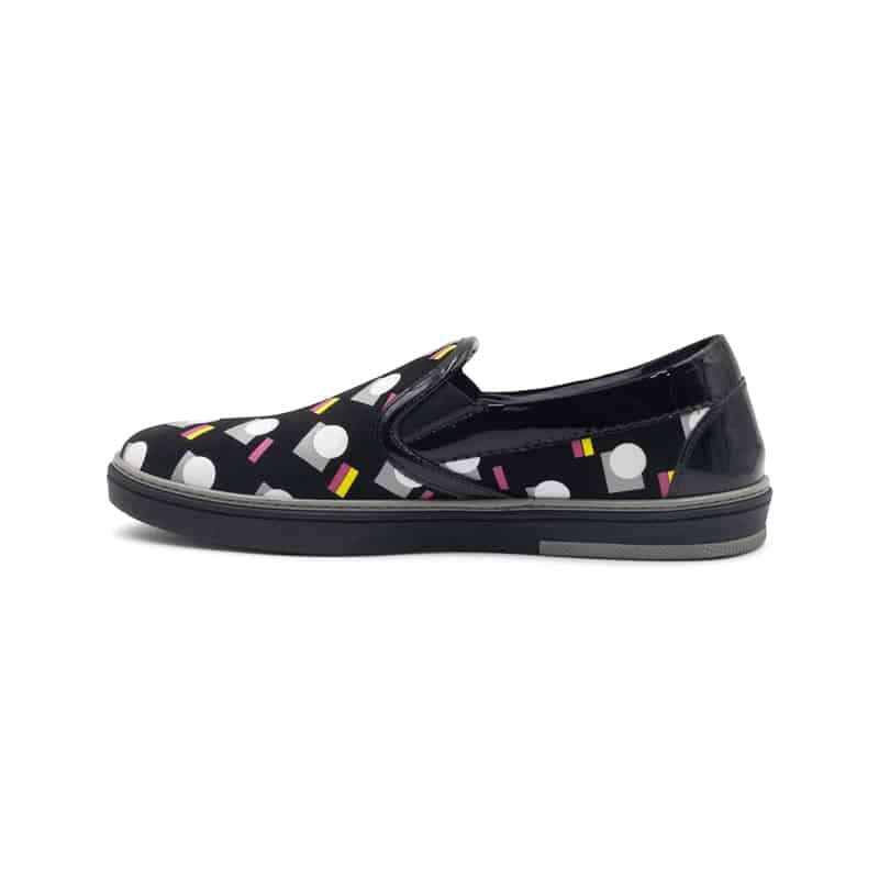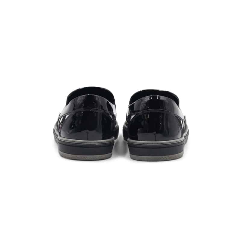 Crafted from a mix of durable textile and smooth patent black leather trim, the Grove Slip-Ons are designed for comfort and effortless wear. Elasticated side panels provide flexibility and a secure fit, while the cushioned leather-lined interior enhances comfort for all-day use. The rubber sole ensures stability and grip, making them a practical yet stylish choice.