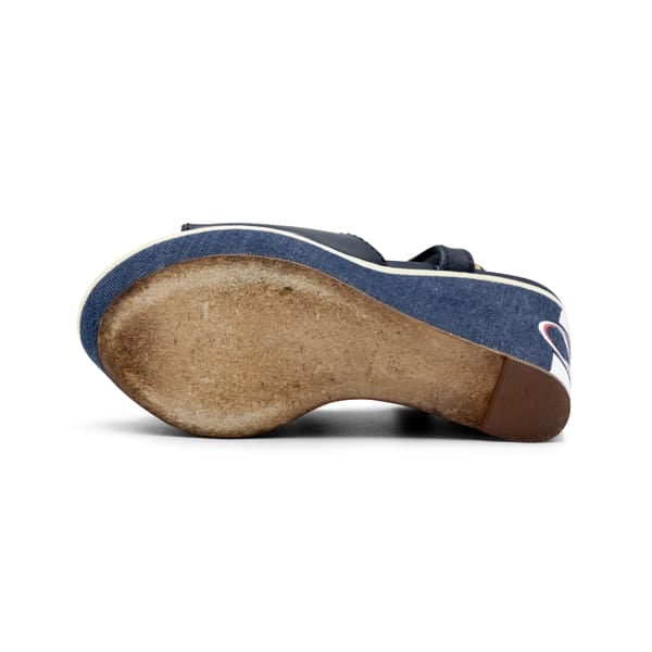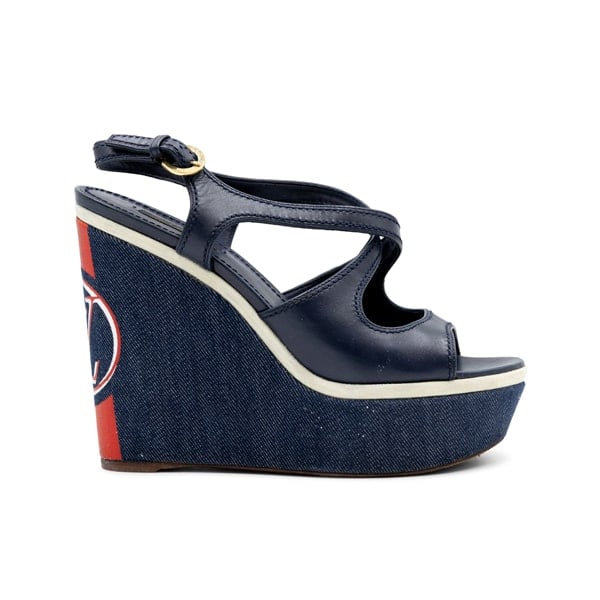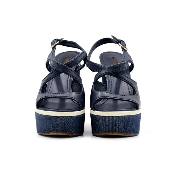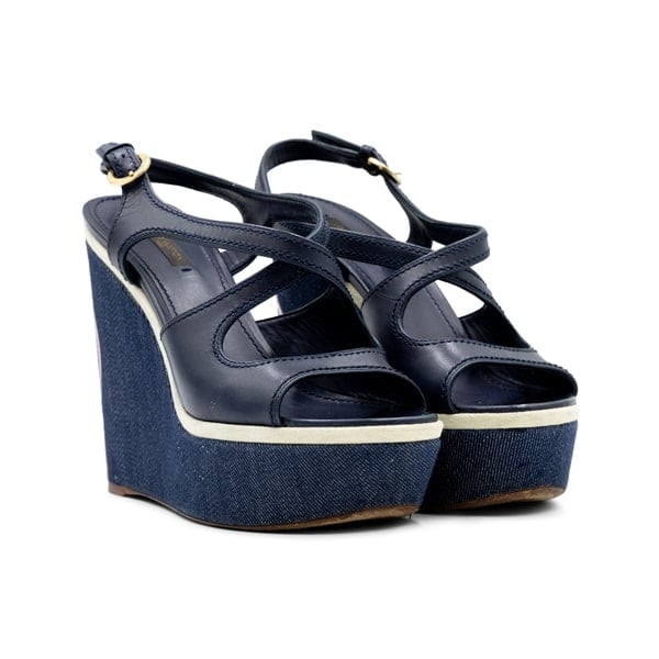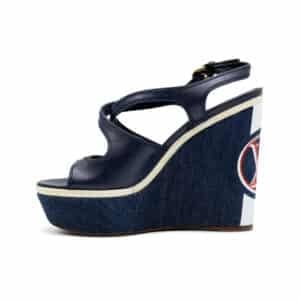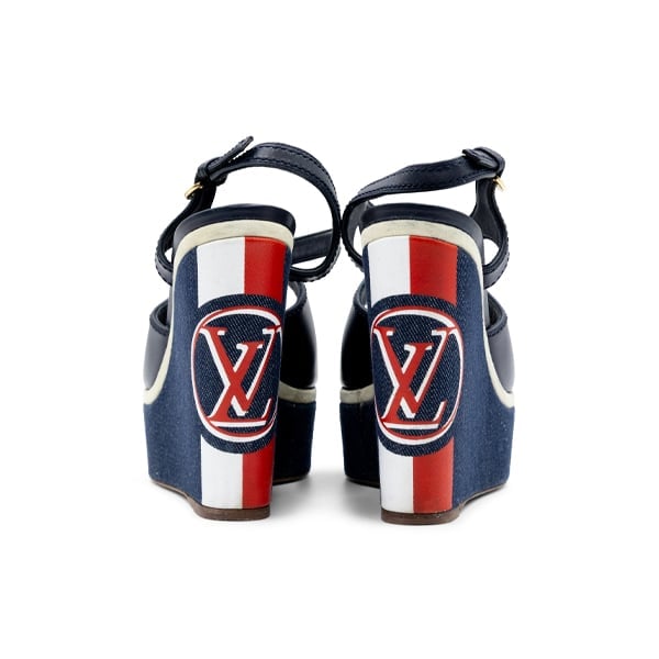 The open-toe silhouette is set on a statement wedge platform, providing both height and stability for comfortable wear. Prominently featuring the LV logo, the design reflects the House’s iconic identity while maintaining a contemporary edge. Ankle or strap fastening ensures a secure fit, while the sturdy sole construction supports all-day wear. Stylish and versatile, these sandals transition effortlessly from daytime outings to elevated casual looks.