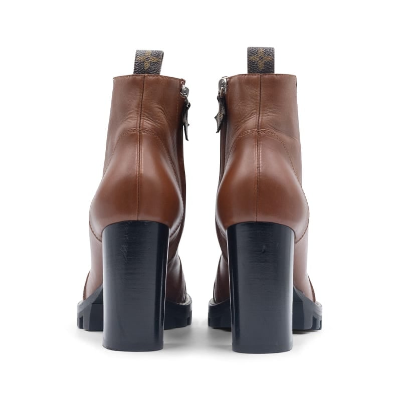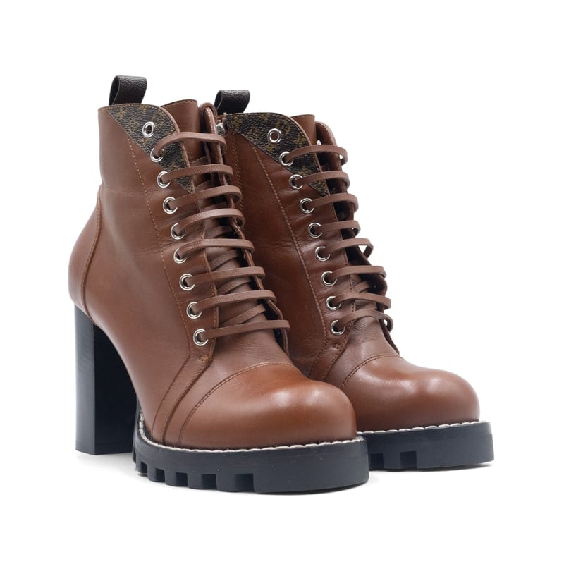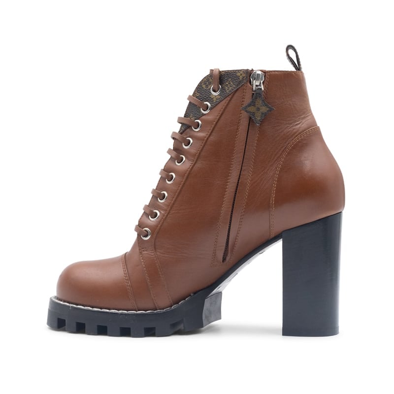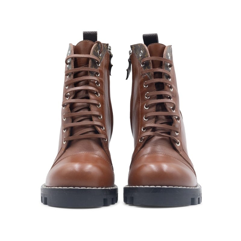 Expertly made in Italy, the boots are crafted from smooth cognac brown calfskin leather and detailed with the Maison’s signature Monogram canvas trim. They feature a chunky platform sole and a sturdy block heel for elevated comfort and confidence. The lace-up front is accented with gold-tone eyelets and a side zip fastening for ease of wear, while the iconic LV branding on the tongue completes the look with timeless elegance.