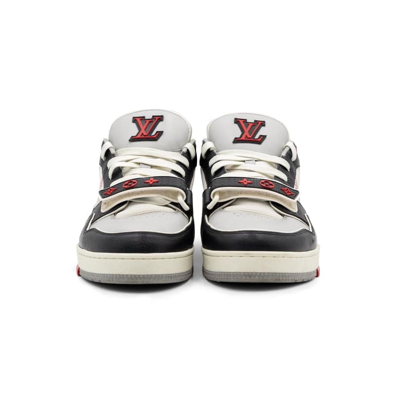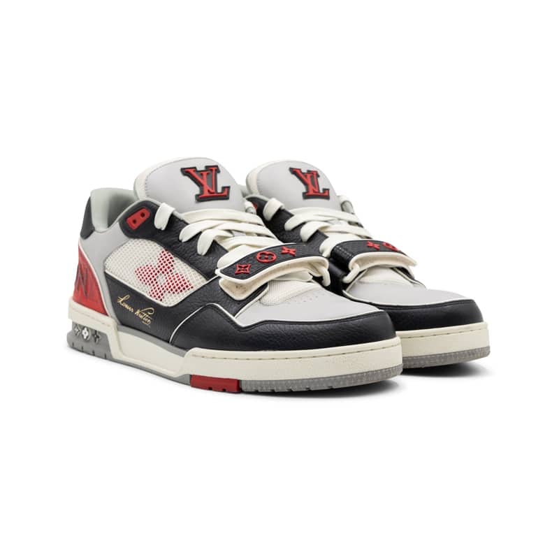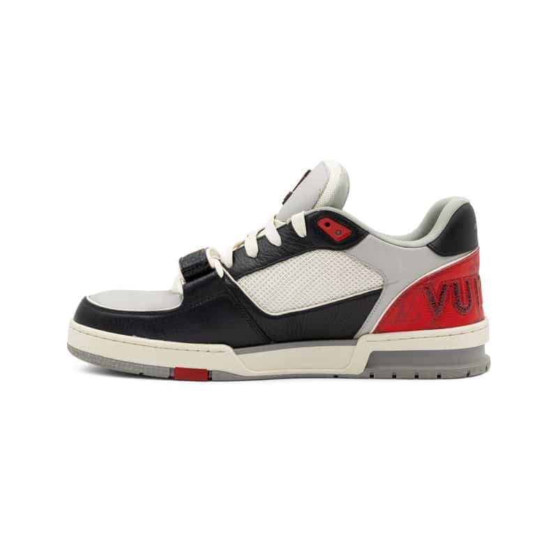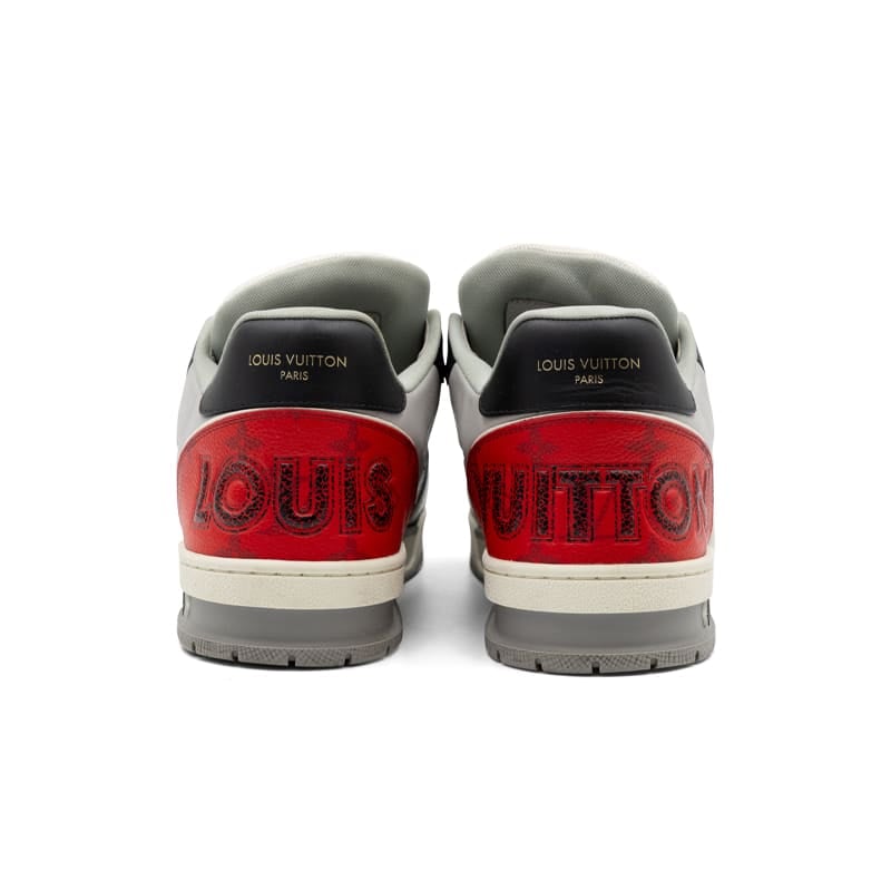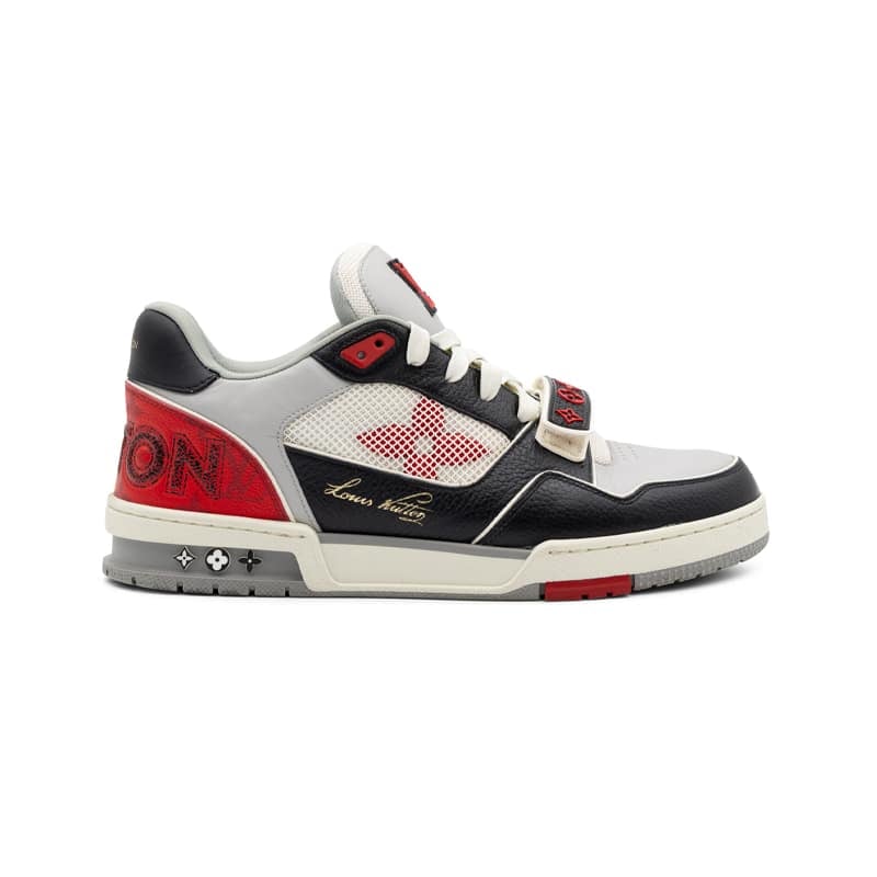 Featuring a dynamic mix of grey, red, and black tones, the sneaker is accented with Louis Vuitton’s iconic Monogram detailing and signature branding throughout. The structured panel construction enhances both support and visual appeal, while the padded interior and robust rubber sole ensure all-day comfort and wearability.