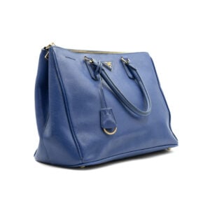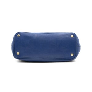 Crafted in Italy from Prada’s signature Saffiano leather, the bag features a rich bluette (deep blue) hue with a lightly textured finish that resists scratches and wear. The spacious, dual-compartment interior is lined in durable fabric and includes multiple pockets for organisation. Gold-tone hardware, rolled leather handles, and the iconic enamelled triangle logo plaque complete the clean, classic silhouette.