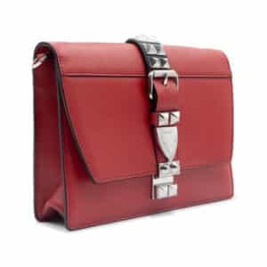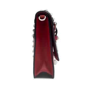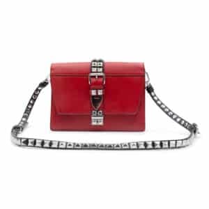 Crafted in Italy from smooth calf leather and signature Saffiano leather panels, the Elektra bag showcases an eye-catching contrast of red and black hues, enhanced by polished silver-tone stud embellishments. The front flap features a structured silhouette secured by a magnetic closure beneath a studded strap accent, adding both function and flair. The interior is neatly lined and fitted with a slip pocket, perfect for organising daily essentials, while the adjustable leather shoulder strap allows for versatile styling as a crossbody or shoulder bag.