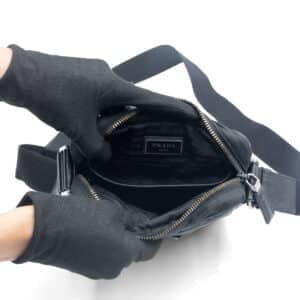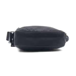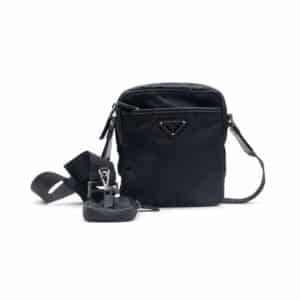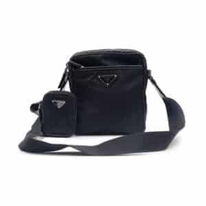 The sleek black body is complemented by polished silver-tone hardware and the iconic enameled triangle logo, lending a structured and contemporary aesthetic. An adjustable webbing strap ensures comfortable crossbody wear, while the bag’s lightweight build makes it ideal for daily use. A detachable small pouch, designed to attach to the strap, adds functional versatility — perfect for storing cards, keys, or earphones with effortless accessibility.