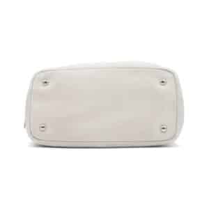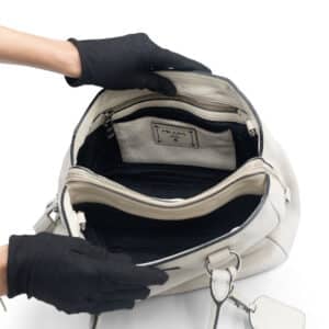 Crafted in Italy from luxurious Vitello Daino grained leather in a soft cream hue, the structured silhouette features dual rolled leather handles and a detachable shoulder strap for versatile carrying options. The signature Prada logo plaque adorns the front in silver-tone hardware, adding a polished finish. The interior is lined in durable logo jacquard fabric and offers generous space with multiple pockets for easy organisation.
