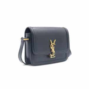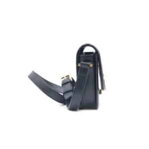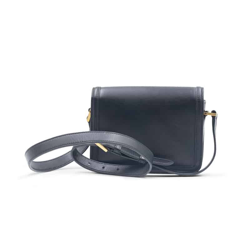 Crafted in Italy from smooth black calfskin leather, this structured satchel features a front flap with the signature gold-tone YSL monogram clasp. The leather-lined interior offers a compact yet functional layout with a central compartment and slip pockets for essentials. An adjustable leather strap allows for shoulder or crossbody wear, making it a versatile piece for both day and evening occasions.