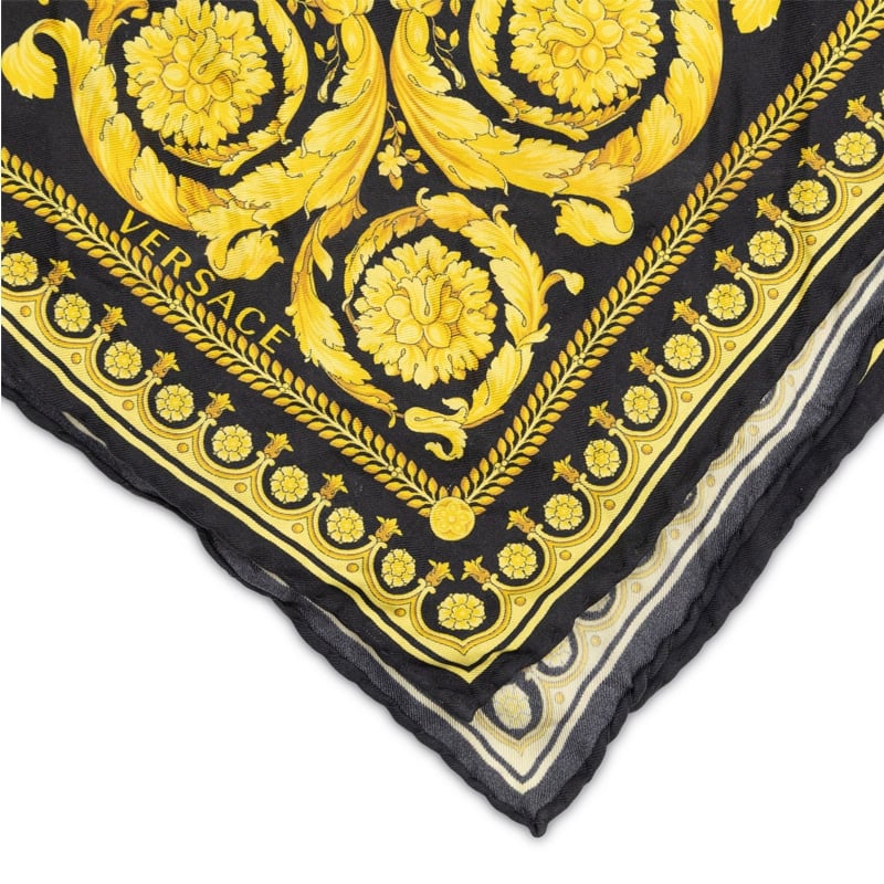 The Versace Black & Gold Baroque Neck Scarf is a statement accessory that embodies the brand’s bold and opulent aesthetic. Crafted in Italy from pure silk, the scarf showcases the signature baroque motif in striking gold tones set against a deep black background, creating an instantly recognisable Versace look.