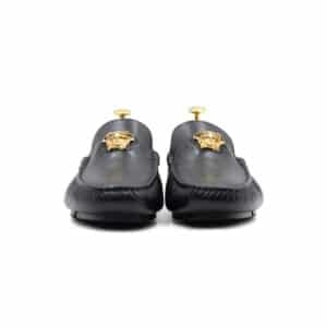 The standout detail is the iconic Medusa head embossed on the upper, a signature gold-tone Versace motif that adds bold luxury to the understated silhouette. The leather-lined interior and cushioned footbed ensure comfort, while the slip-on design allows effortless wear. Ideal for both casual and smart-casual styling, these loafers balance timeless elegance with contemporary Italian craftsmanship.