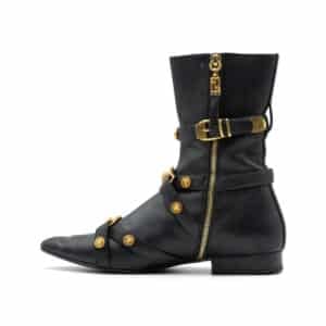 The sleek pointed toe and flat sole are complemented by the brand’s iconic Medusa medallion hardware in gold-tone, adding a touch of unmistakable Versace heritage. A side zip closure ensures ease of wear while maintaining the streamlined shape.