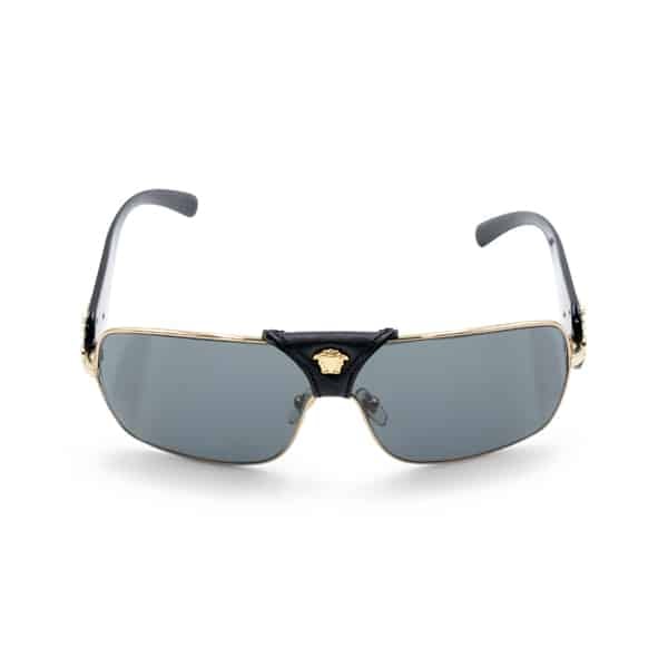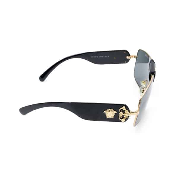 Defined by distinctive Versace detailing, the sunglasses feature Medusa branding at the temples and sculptural elements that enhance their statement appeal. The grey-toned lenses provide reliable UV protection, while the lightweight construction ensures comfortable, all-day wear. Finished with gold-tone hardware, this model seamlessly blends luxury with modern attitude.